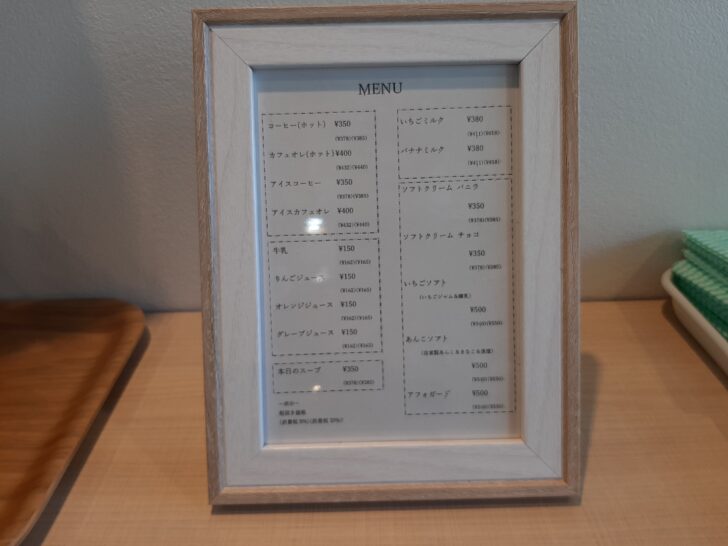 ドリンクメニューは、コーヒー、カフェオレ、牛乳、ジュース、本日のスープ、ソフトクリーム等がありますね。