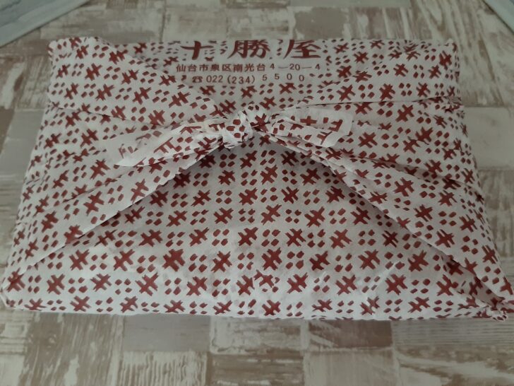 今回は、焼きだんご6本と、甘納豆(紫花豆)、まめどら5個を購入しました。焼きだんごはこんな紙の風呂敷に包んでくれました。