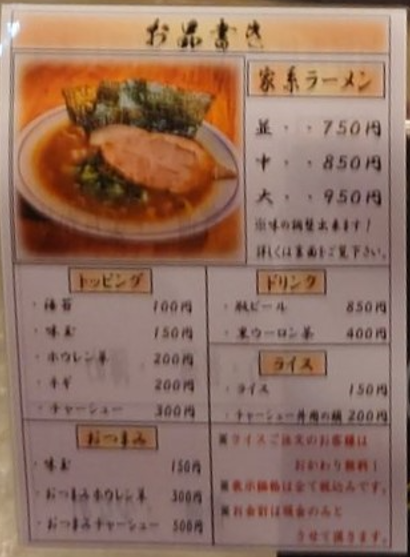 家系『らーめん月天洋(仮)』のメニューは次のようになるようです。らーめんは家系らーめん1種類のみ(並・中・大)。トッピング各種とライス、チャーシュー丼などですね。