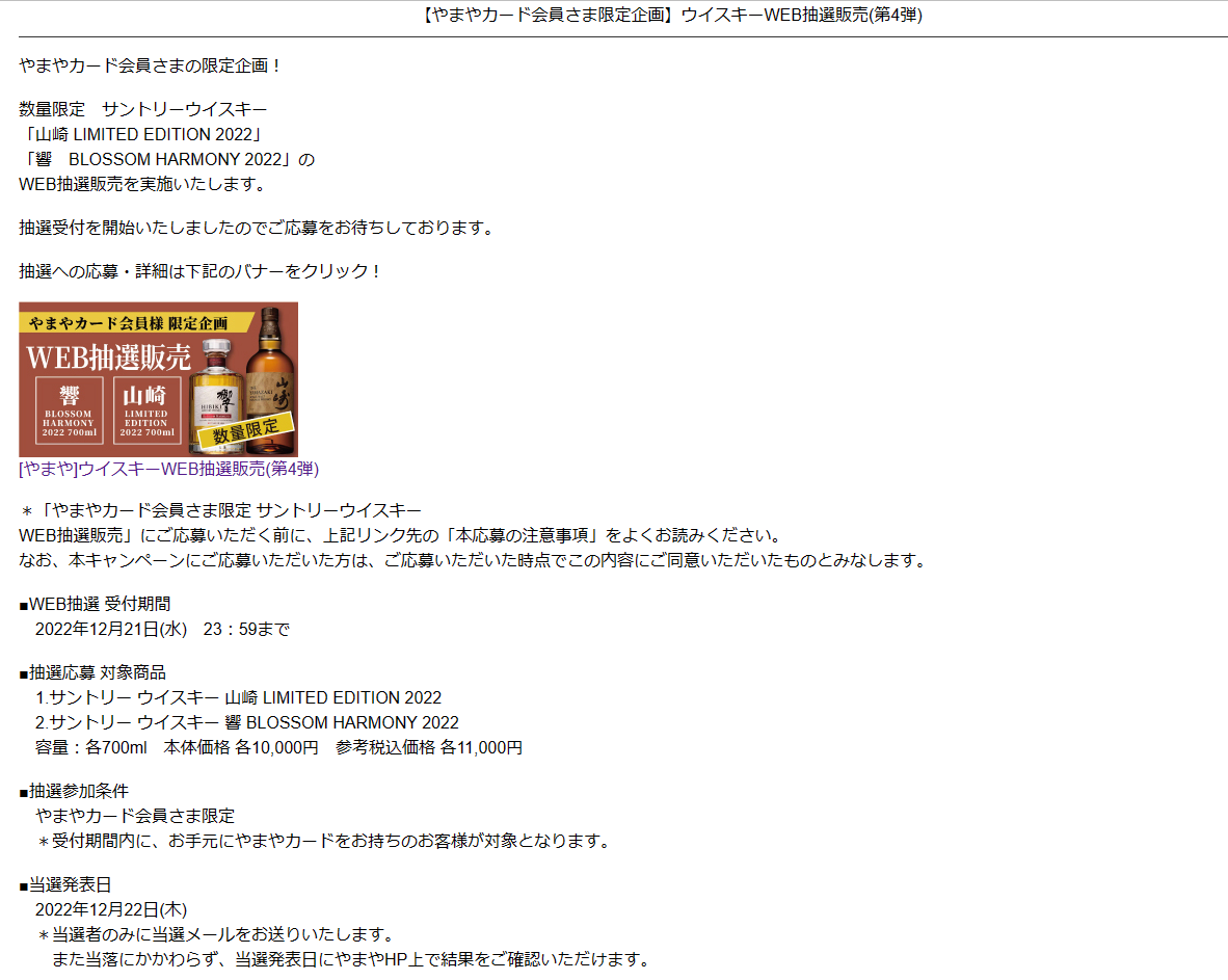 2022年最後となると思われる『酒のやまや』のサントリーウィスキー【響&山崎】のWEB抽選販売(第4弾)がやまやカード会員限定で2022年12月14日~12月21日迄行われているので紹介します。