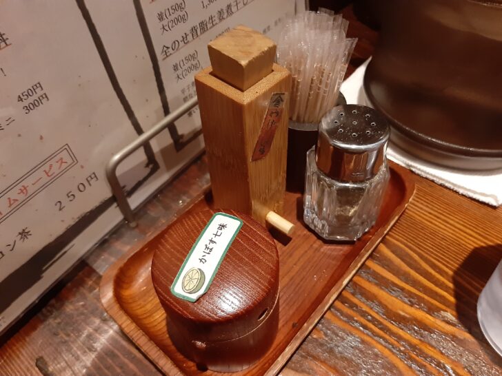 卓上調味料は、胡椒、七味唐辛子、かぼす七味唐辛子のみでした。