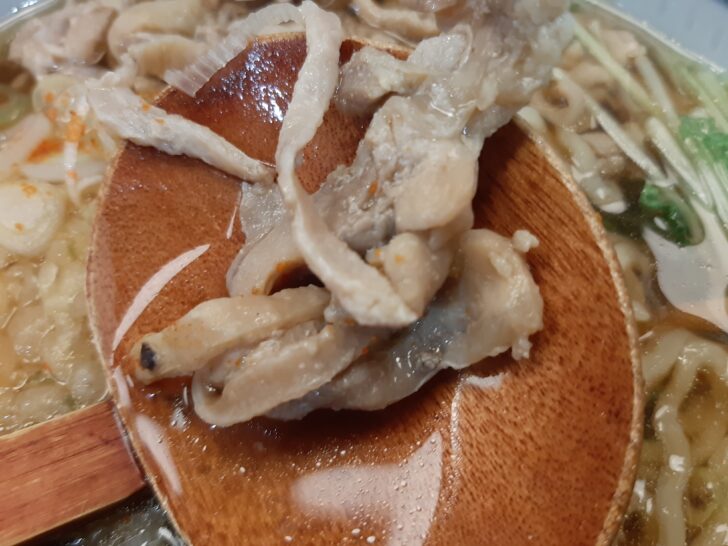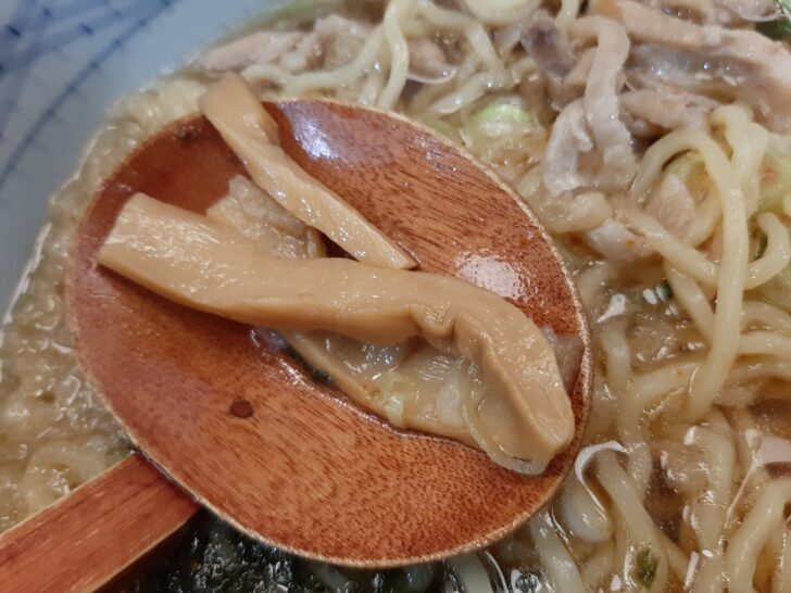 具材は、鶏肉(親鳥)、メンマ、きざみ海苔、揚げ玉、ねぎ、水菜ですね。