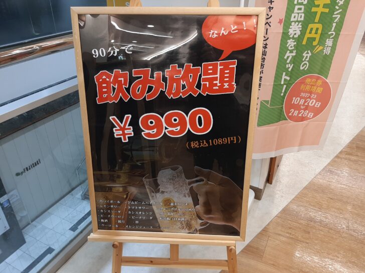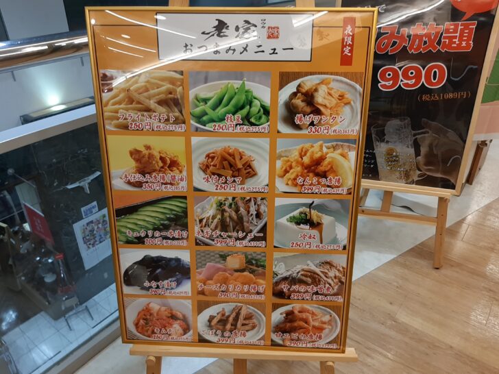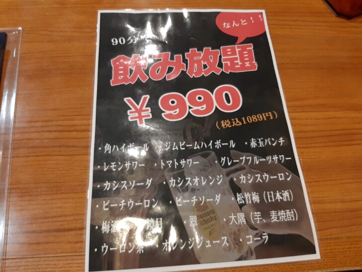 お店の情報が掲載されている(老家)食べログにも情報が出ていなかったのですが、実は飲み放題のメニューがあったのです。「90分飲み放題\990(税込1089円)」というものでした。但し、瓶ビール、生ビールは含まれていません。