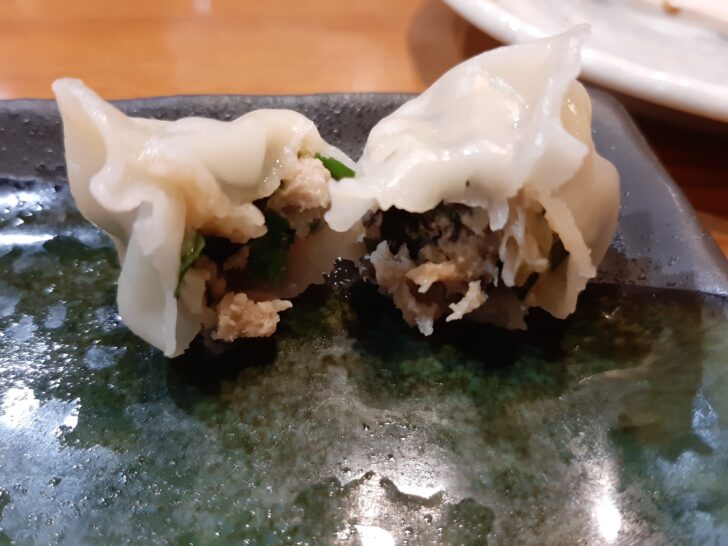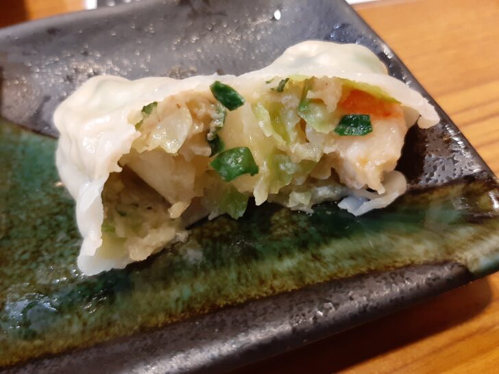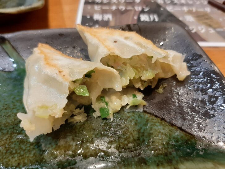 次に焼き餃子税込\275】を注文。お店のおすすめのように、まずはタレを付けないで食べてみました。そうしたら、野菜の甘みが強くて、タレなしでも充分美味しく戴けました。餃子の中身は、こんな感じで、具がパンパンには詰まっていません。野菜多めなので、甘いんですかね。