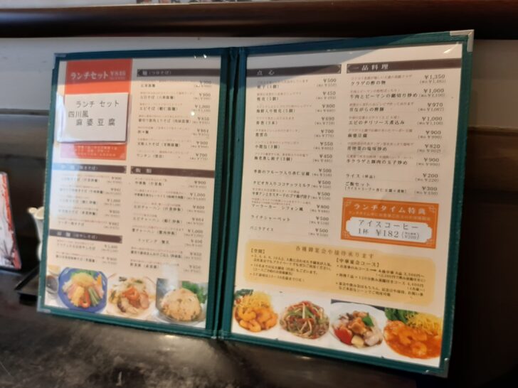 おすすめはやはりお得なランチセット【税込930円】ですね。本日は、「四川風 麻婆豆腐」でした。他にも麺類、御飯物、点心、一品料理などのメニューがあります。