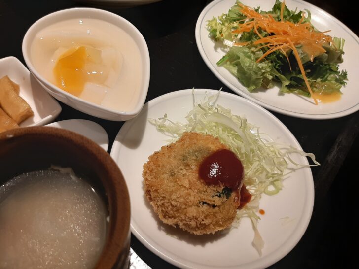 ランチセットは、メイン料理1品、サイド料理1品、サラダ、漬物、デザート、御飯(おかわり自由)または、おかゆです、スープです。
