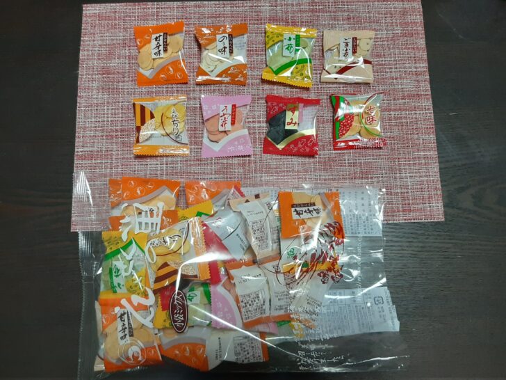 何が良いのかというと、小さめのえびせんべい8種類が、小袋に入っていて、色々な味を楽しめるのと、1袋の量が少ないので小腹が空いた時に気軽に食べられるし、個装なので湿気ることもないんです。
