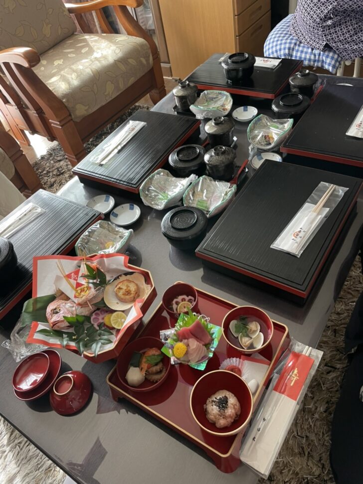 仕出し料理は時間通りに配達していただきました。また、配膳はお願いしていなかったのですが、丁寧に配膳もしていただき丁寧に説明してくれました。料理の梱包も完璧で、お造りは、保冷剤で冷たく、茶碗蒸し、お吸い物などの温かい料理は温かいままでした。料理は予想以上に豪華で、家族全員が大満足でした。大事な記念日を気持ち良くお祝いできて、本当に良かったです。ありがとうございました。また機会があれば、お願いしたいと思います。