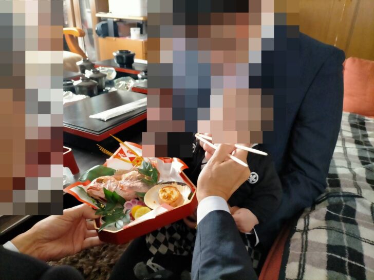 今回の出席者は、赤ちゃんと両親と祖母祖父と曽祖母の6人でした。それで大人用の料理は、人気ナンバーワンの「箱御膳会席」【3,710円(税込)】にしました。「箱御膳会席」は、比較的リーズナブルで慶弔問わずご注文できる人気メニューのようです。お重の中には季節の八寸や天ぷら盛り合わせ、焚き合わせや酢の物、フルーツを詰め合わせています。付属でお吸い物、お造り盛り合わせ、季節の御飯、茶わん蒸しが付いています。会席料理のフルコースの内容がこのお料理で全て楽しめるようです。更に写真投稿キャンペーンを実施中だったので、参加すると513円割引(WEB上クレジットカード決済のみ適用)となります。