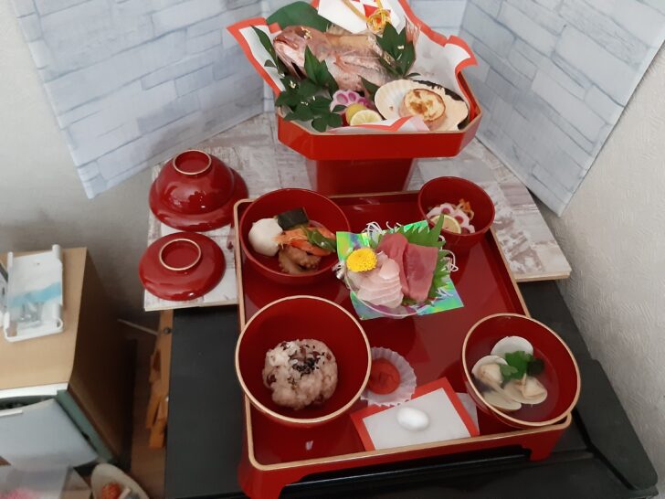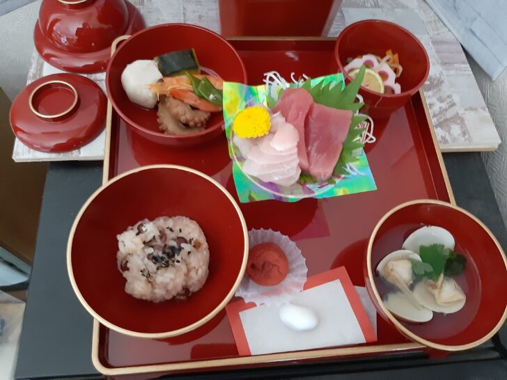 赤飯、煮物(たこ、海老、里芋、カボチャ、エンドウ)、お造り(まぐろ、鯛)、お吸い物(はまぐり)、香の物(梅干し)等です。歯固め石も付いてきました。