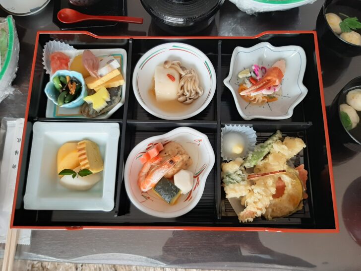 『箱御膳会席』料理は、こんな感じでした。お造り、茶碗蒸し、お吸い物、しめじ御飯と想像していたより豪華でした。