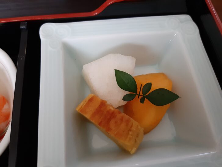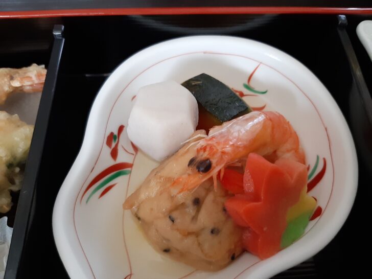 焚き合わせは、里芋、かぼちゃ、海老、がんもどき、かまぼこの炊き合わせです。