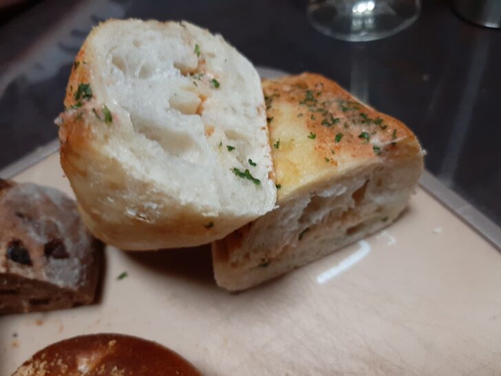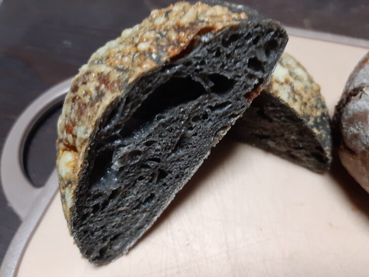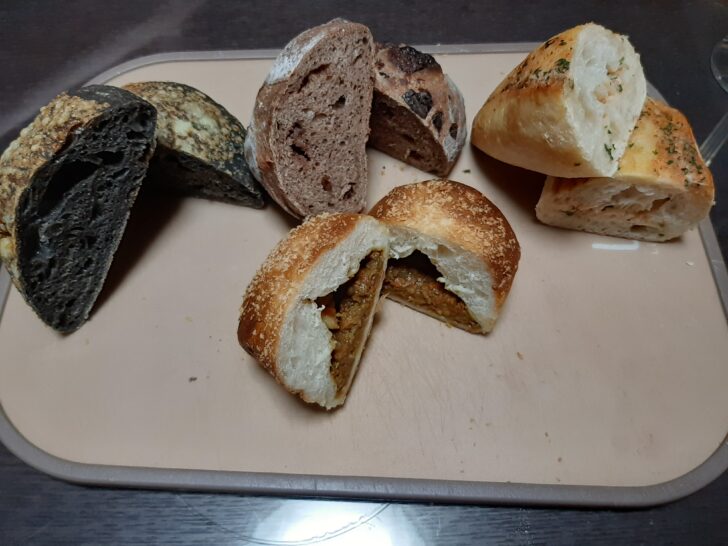 今回購入したパンは、手前左より、「いか墨チーズ」【税込\320】、「ショコラチャバタ」【税込\350】、奥側左より「にんにく明太子」【税込\300】、「カレーのパン」【税込\230】ですね。甘いパンは余り食べないので、クリームパン、あんぱん、メロンパンは購入しませんでした。