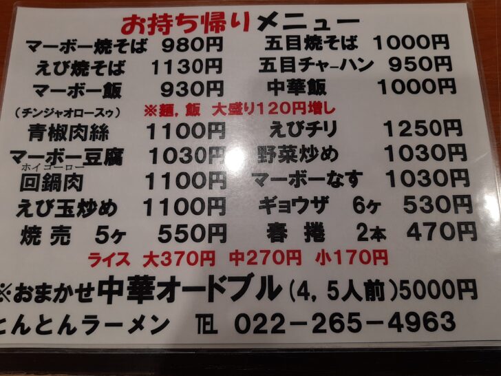 『とんとんラーメン』では、お持ち帰りもできます。お持ち帰りメニューは、次の通りですが、ラーメン系はダメですが、焼きそば、御飯物、中華総菜、点心などが持ち帰り可能ですね。