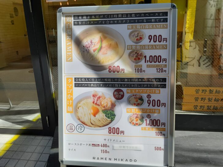 『らぁ麺みかど』は、「らぁ麺すみ田」のセカンドブランドのお店で、2022年5月にオープンしました。当初のラーメンメニューはメインの「鶏白湯らーめん」、「貝だし清湯らーめん」、「鰹昆布水つけ麺」「台湾まぜそば」の4種類でしたが、リニューアル後は、「鶏白湯らーめん」と「タマゴかけ麺」の専門店となったようです。それに今回新たに「軍鶏らーめん」が加わり、今後は「鶏白湯味噌らーめん」が追加となるようです。