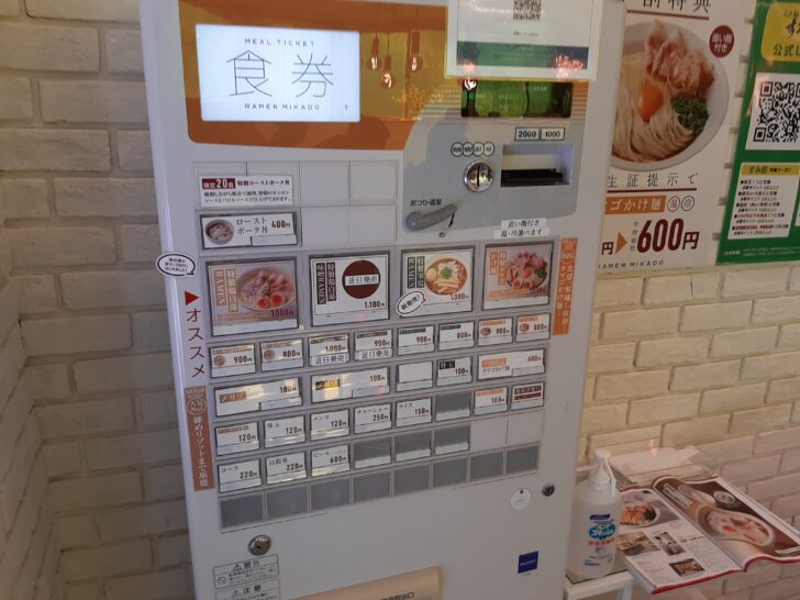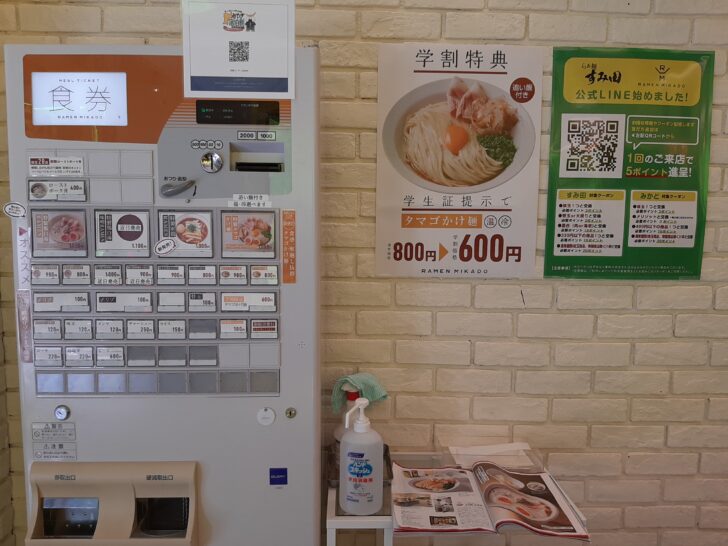 入店するとすぐ左側に食券の券売機があります。「らぁ麺すみ田」も同じですが、『らぁ麺みかど』も学生には嬉しい学割特典があり「タマゴかけ麺」が【800円⇒600円】と200円引きになります。