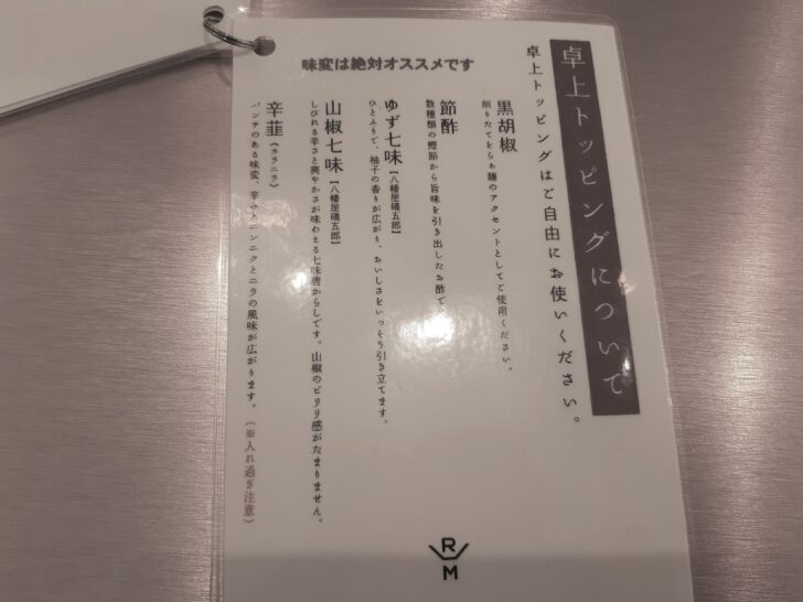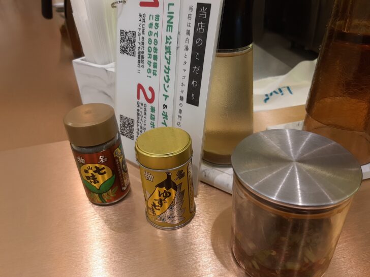 卓上調味料は、黒胡椒、節酢、ゆず七味、山椒七味、辛韮の5種類もあったので、味変が楽しめました。