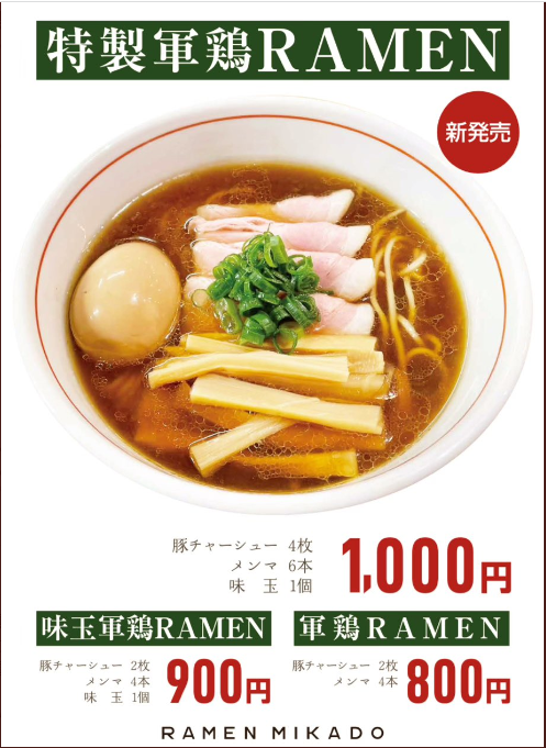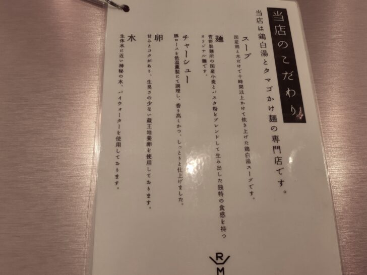 『らぁ麺みかど』のメニューはメインは「鶏白湯らーめん」と「タマゴかけ麺」で、軍鶏RAMENとこれから販売予定の鶏白湯味噌RAMENを加えて4種類となるようです。そしてこれにそれぞれ、味玉をトッピングしたもの、味玉やチャーシュー等をトッピングしたものになりますね。具体的なメニューは次の通りです。