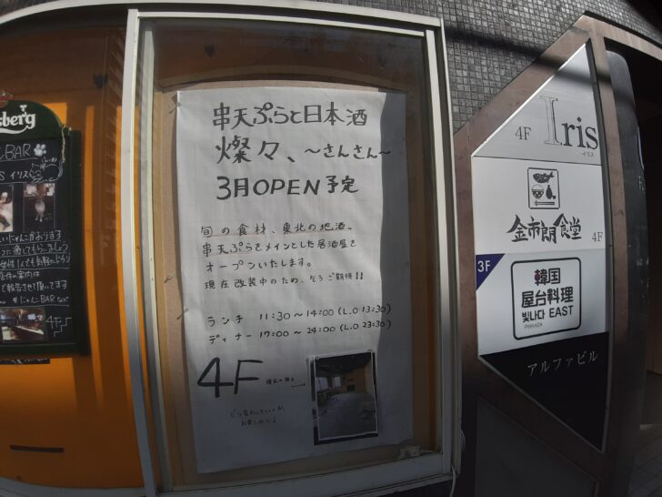 『天ぷらと日本酒 燦々、(さんさん)』は、閉店した金市朗食堂の跡地にオープンするようですが、どのようなお店になるかというと、旬の食材、東北の地酒、串てんぷらをメインとした居酒屋となるようです。尚、ディナーだけでなく、ランチも提供するようです。どんなメニューを提供するのかは、情報がないので、現状は分かりません。