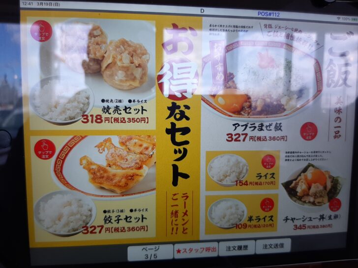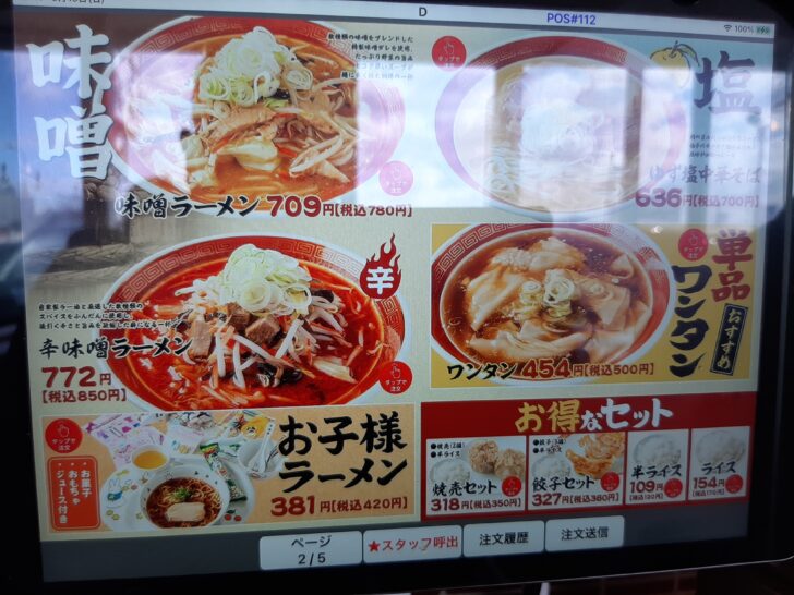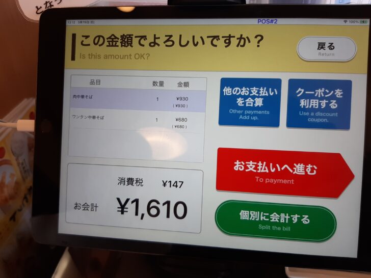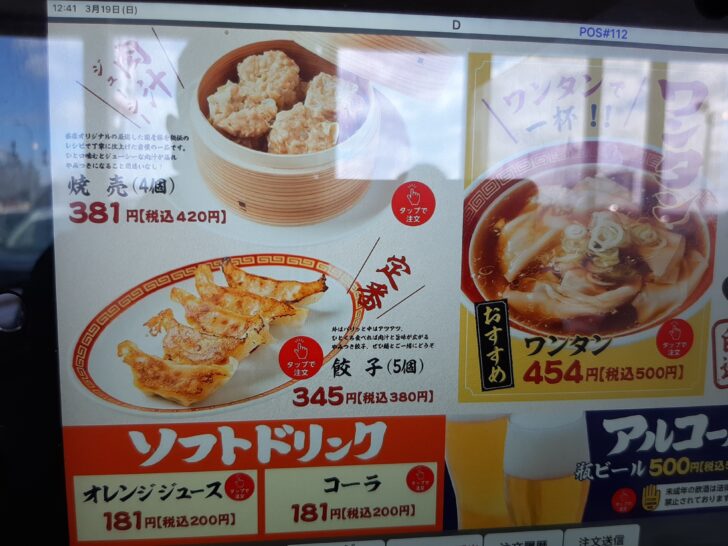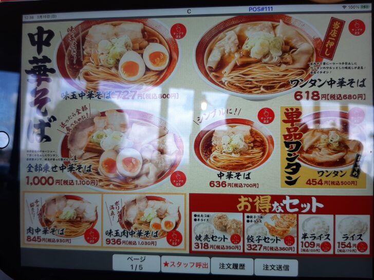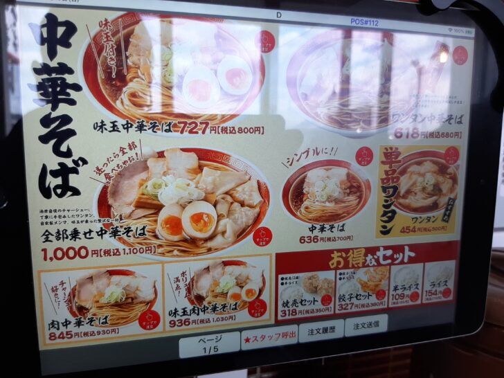 『肉中華そば源楽』という店舗名になっていますが、お店の一押しは「ワンタン中華そば」となっているようです。リニューアルで注文はタブレットになったようなので、簡単に注文できるようになったのは良いですね。