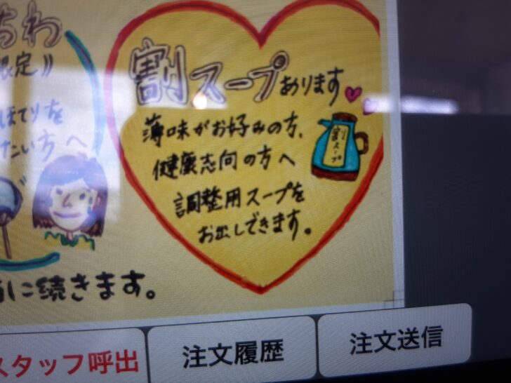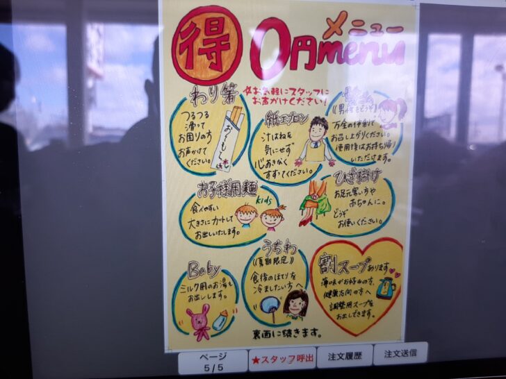 面白いのは、0円メニューがあることですね。わり箸、紙エプロン、髪ゴム、お子様用麺、ひざ掛け、赤ちゃんのミルク用お湯、うちわ、割スープが0円で提供されます。