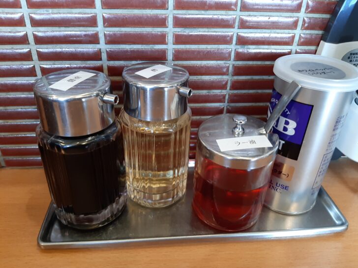 卓上調味料は醤油、酢、ラー油、ホワイトペッパーです。