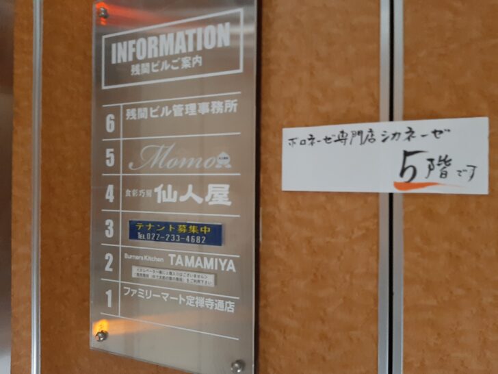 『シカネーゼ』の場所は、残間ビル5Fの「大人焼肉 MOMO」を昼の間だけ間借りして営業しています。エレベータには貼紙が貼ってあるので、分かり易いです。