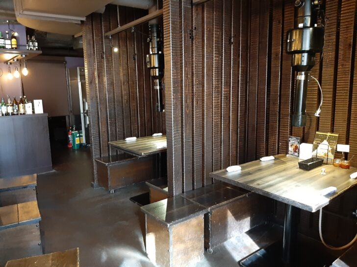 お店は焼肉店「大人焼肉 MOMO」なので、各テーブル席には、排煙ダクトが設置されていましたね。席数も36席とおおきめなお店ですね。