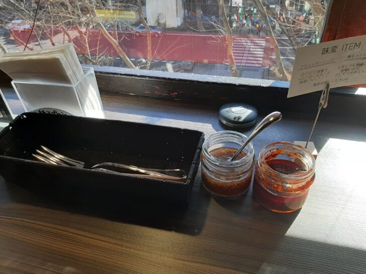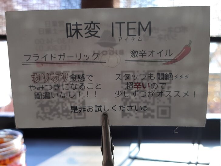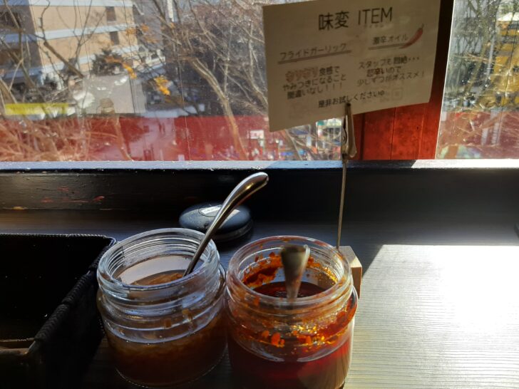 カウンターには味変ITEMの卓上調味料が2種類(フライドガーリックと激辛オイル)が置いてありました。