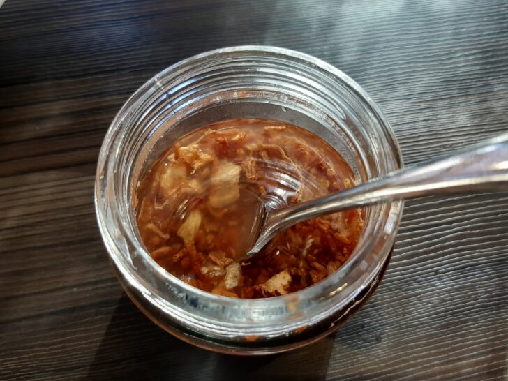 これが、味変ITEMのフライドガーリックです。オイルにフライドガーリックがたっぷり入っています。