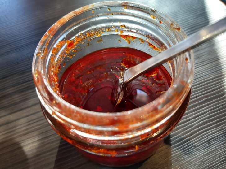 これが味変ITEMの激辛オイルです。オイルにフライドガーリックがたっぷり入っています。