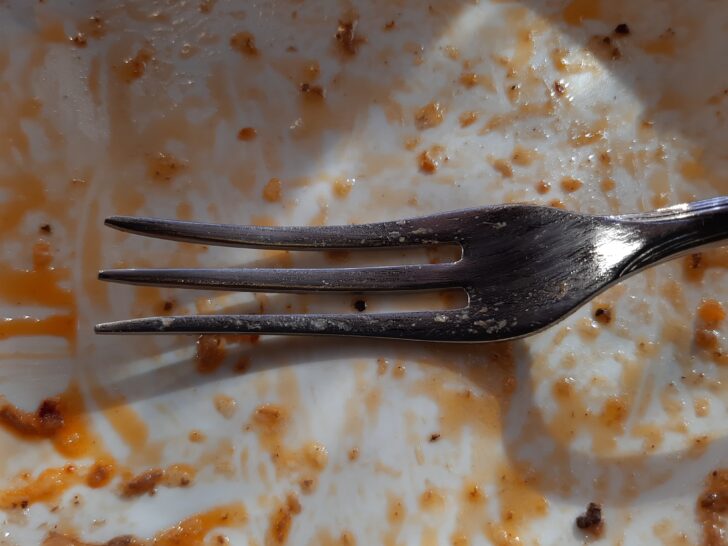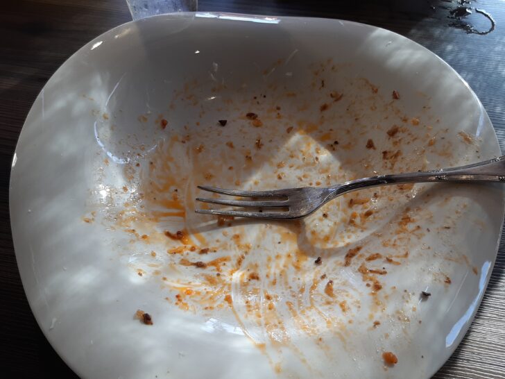 良く見たらフォークが変な形状の物になっていました。私は知りませんでしたが、かみさんに聞いたらパスタ専用にデザインされたフォークらしいです。刃先が扇状に広がっていて、様々な太さのパスタを潰さず巻けて、お皿を傷つけないようになっているようです。