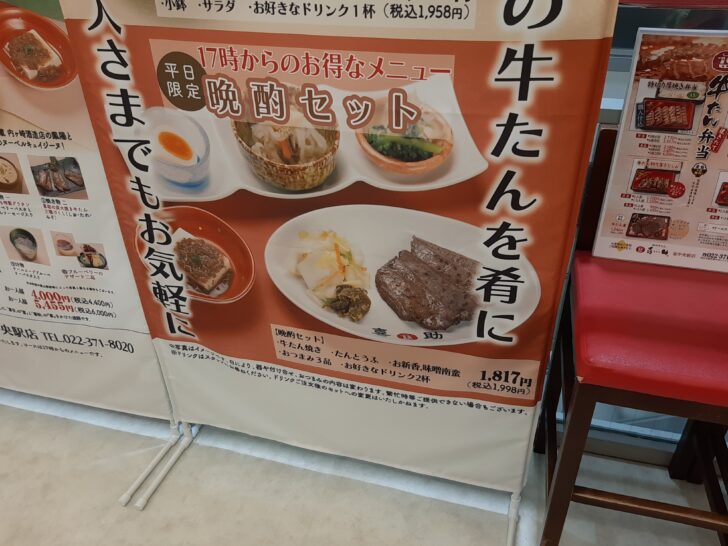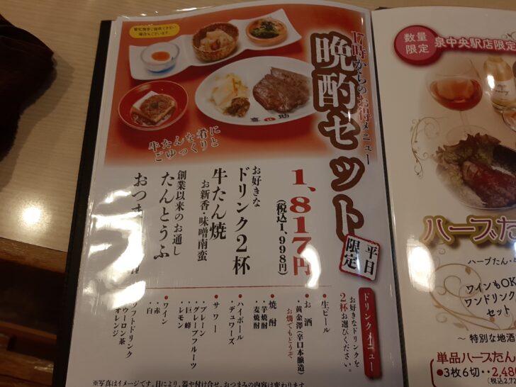 「晩酌セット」は、平日限定で17時からのメニューとなります。ドリンク2杯と牛たん焼、たんとうふ、おつまみ3品が付いて【税込1,998円】と激安で、お得ですね。
