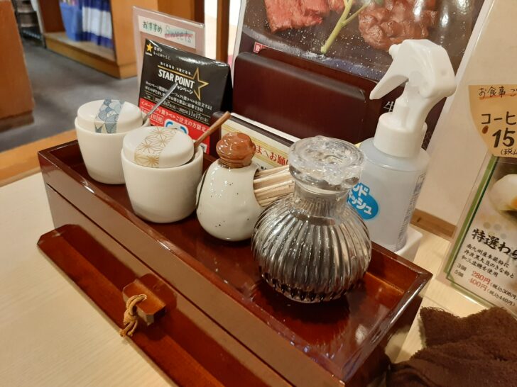 卓上調味料は、胡椒、唐辛子、醤油が設置されています。