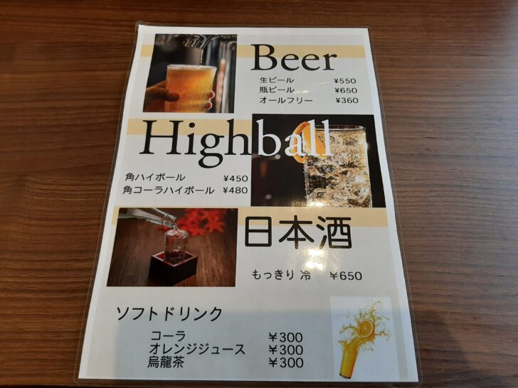 ドリンクメニューは、ビール、ハイボール、日本酒、ソフトドリンクがあります。