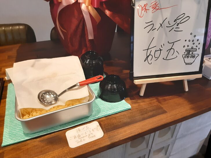 これは、取り放題のあげ玉です。温かいそば用だと思いましたが、実はラーメンに入れて味変すると美味しいとお店の方が教えてくれました。あげ玉は、ごま油であげているそうで。ラーメンに合うそうです。