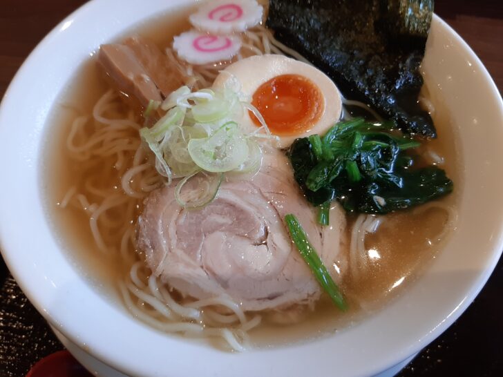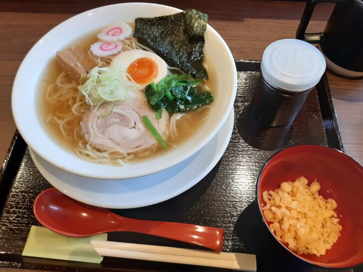 まずは、中華そばです。「麺や鸞(めんやらん)」で人気の中華そばは、健在で、【税込650円】と激安でした。ホワイトペッパーが一緒に提供されました。またお店の方にあげ玉を入れると美味しいと言われたので、取ってきました。