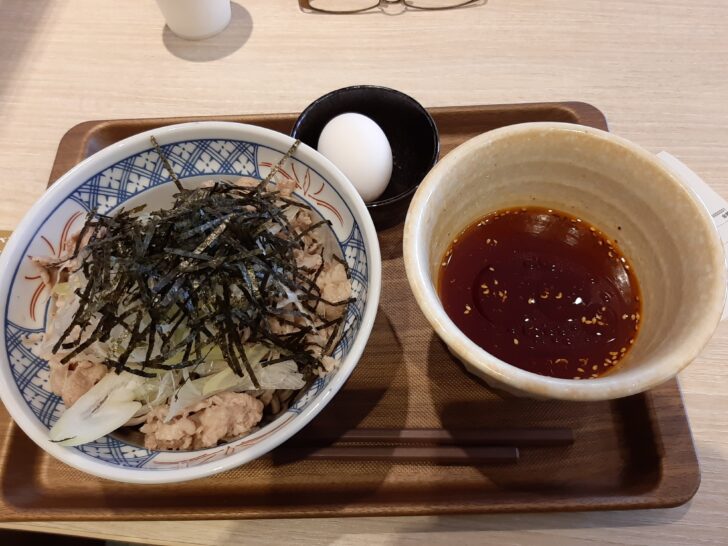 今回は、「旨辛牛つけそば(並)」+「卵付き」で冷たいつけだれで注文しました。