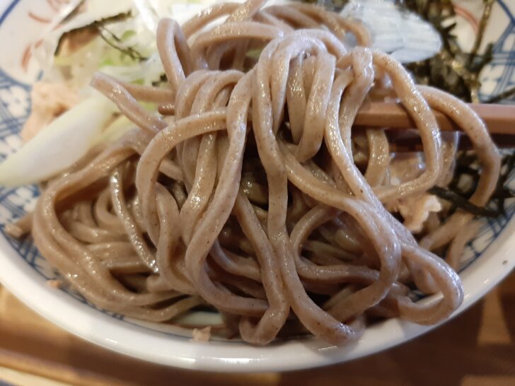 挽きぐるみの田舎そば風なので、独特の風味でコシも強く、つけ汁につけても存在感が感じられる、また、ツルっとしたのど越しが楽しめる。