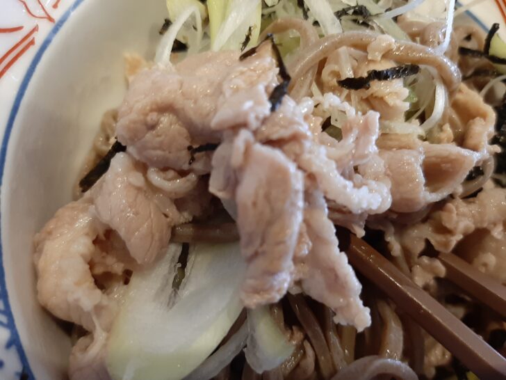 「牛」「豚」は出汁で炊き上げ一度寝かせて出汁を染み込ませて肉の旨味を引出している。「鶏」はカリッと揚げて唐揚げのようになっています。蕎麦に山のように盛り付けた肉が楽しめます。