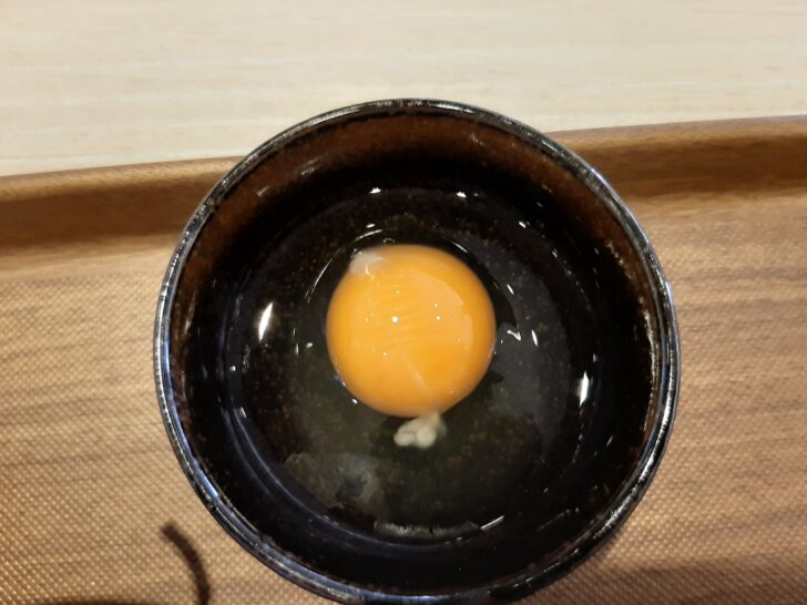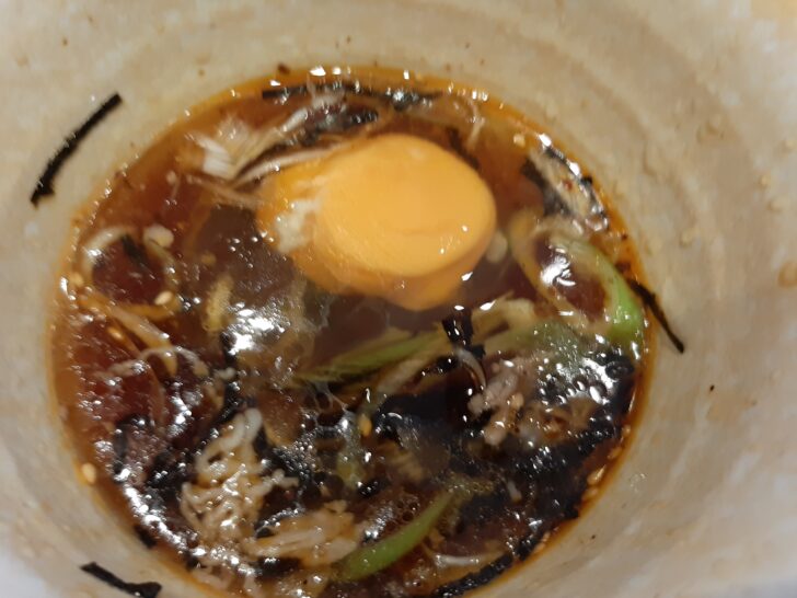 途中で生卵を入れて、味変してみます。こうするとやはり円やかになりますね。