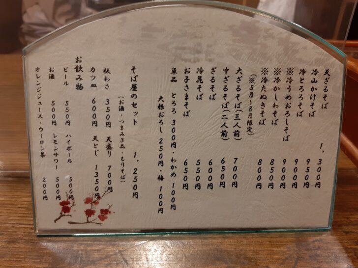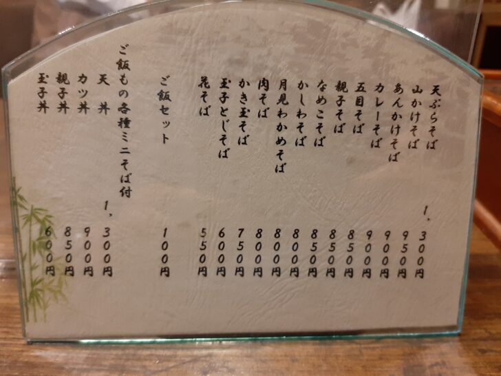 メニュー表は裏表があります。表面は冷たい蕎麦、おつまみ、お飲み物のメニューです。裏面には、温かい蕎麦とご飯もののメニューですね。