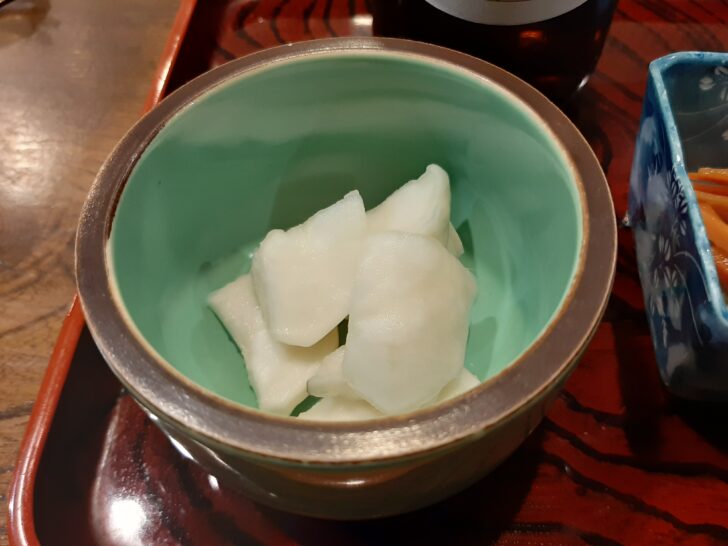 おつまみ1品目はカブの甘酢漬けでした。味付けも良くて美味しいですね。