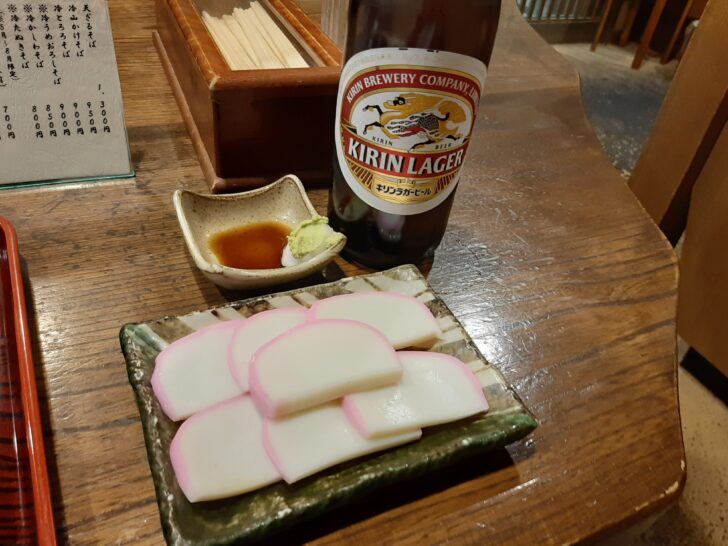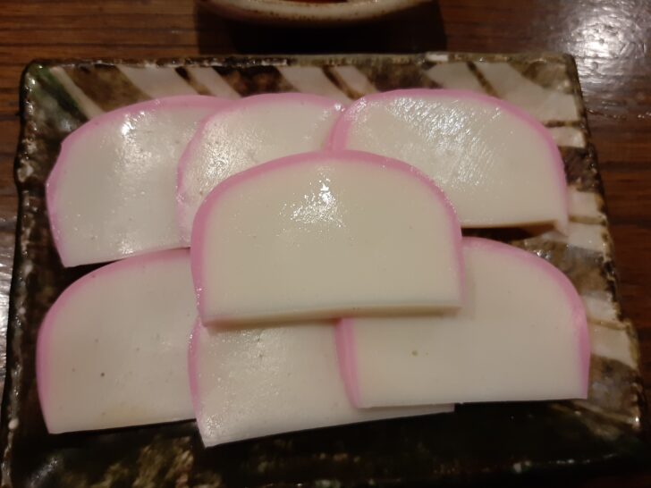 今日は、暑い中、長時間ウォーキングしたので、ついビール【\550】をもう一本追加注文してしまいました。つまみもなくなったので、板わさ【\350】を追加注文しました。提供された板わさを見て、そのボリュームにびっくりしました。なんと蒲鉾が7枚も積み重ねてありました。