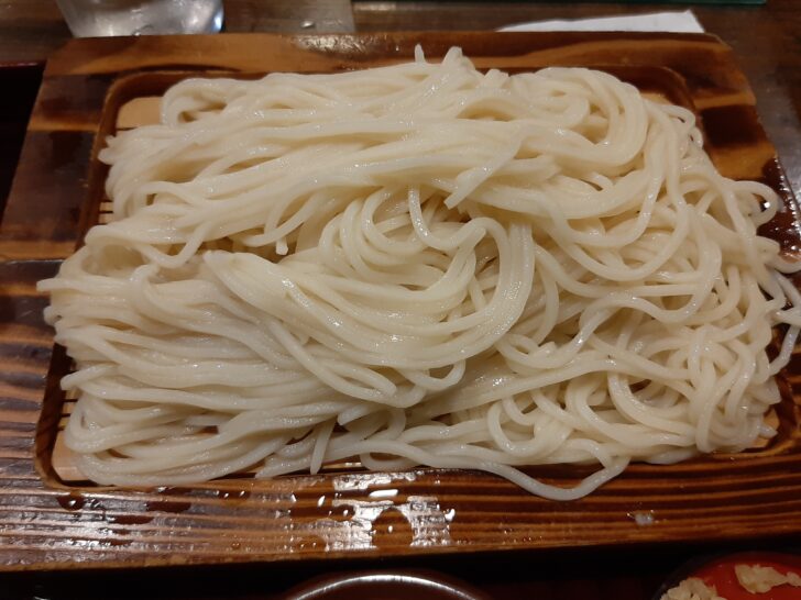 更科そば『丸よし』は、仙台で初めて更科蕎麦の提供を始めたお店で、明治初期に営業開始し創業120年を越える老舗です。更科蕎麦は一番粉と言われるそばの実を挽いたとき一番最初に出てくる中心部分の白い粉を使って作る蕎麦なので、もちろん蕎麦の色も白になります。更科蕎麦は白いので高級感があり、ほのかな甘みとつるつるのコシとのど越しが良いのが特長ですね。