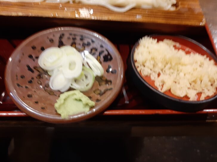 ねぎとワサビの薬味の他に天かすも付いているのは嬉しいですね。