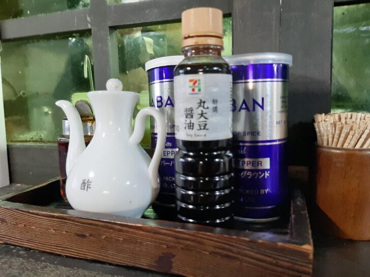 卓上調味料は、醤油、酢、ラー油、ホワイトペッパー、ブラックペッパーですね。