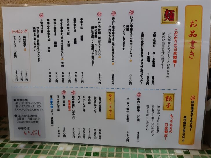 こちらがグランドメニューですね。一番人気の「いぶし中華そば」、「岩のり塩中華そば」、「いぶしつけ麺」がおすすめのようです。