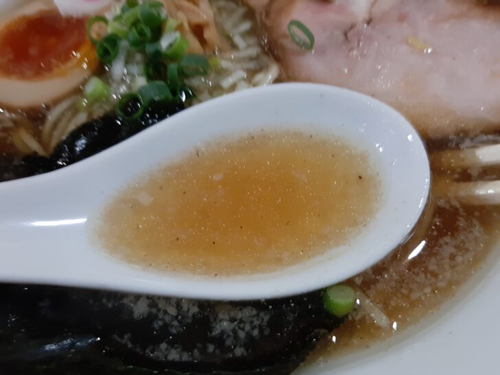 スープは、基本的には、あっさり系の醤油スープですが、こってりにしたので、背脂が追加されているようです。イワシやアジ等を燻製したものと煮干し等の旨味があって美味しいスープです。