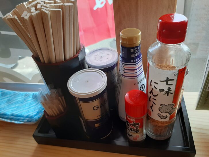 卓上調味料は、ホワイトペッパー、ブラックペッパー、醤油、七味唐辛子、七味にんにくがありました。